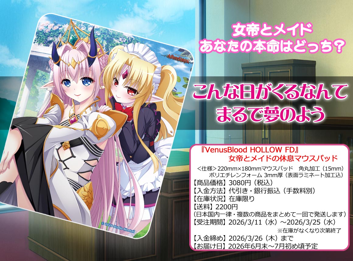 『VenusBlood After Days Ep10 白の女帝は癒されたい』 『VenusBlood After Days Ep11 漆黒のメイド長奮闘記』に合わせて、皇帝となったシルヴィアと、メイドになったアノーラの仲睦まじいツーショットを、マウスパッドにしました!